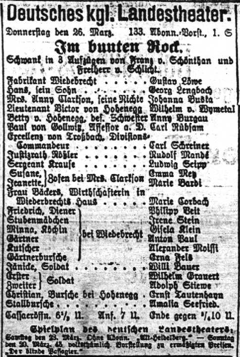 ..., übermorgen Dienstag wird das neue Schönthan-Schlicht'sche Lustspiel „Im bunten Rock”, das sich mit besonderer Zugkraft im Spielplane behauptet, gegeben.