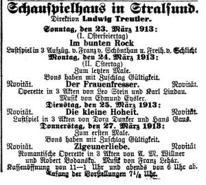 Für Fräulein Beatrice Stürzel, die einen Vertrag auf dem Standesamt abschließen wird, wird für den Rest der diesjährigen Spielzeit Fräulein Helene Dornau von Rostock als Naive eintreten und am ersten Festtag in dem Lustspiel „Im bunten Rock” eine Probe ihres Könnens ablegen, desgleichen Fräulein Hermine Hansing als erste Liebhaberin, sowie Herr Reinhold Moser, der für den nach erfolgreichem Gastspiel nach Erfurt engagierten Herrn Hans Grün für nächsten Winter in Frage kommt. Anstelle des Herrn Edelbert Gareis tritt Herr Hans Jüngst von Bielefeld zunächst für den Rest der Spielzeit, die bis Mitte April dauert.