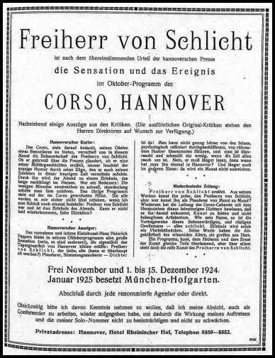 unter „Kleine Notizen” | Freiherr von Schlicht veröffentlicht in unserer heutigen Nummer einen Auszug der hannoverschen Presse über sein mehr als erfolgreiches Gastspiel im „Corso” in Hannover, auf das wir an dieser Stelle besonders hinweisen möchten. Gleichzeitig bittet Freiherr von Schlicht, davon Kenntnis nehmen zu wollen, daß er seine Absicht, auch als Konferenzier zu arbeiten, wieder aufgegeben hat, um dadurch die Wirkung seines Auftretens von seiner Solonummer nicht abzuschwächen. Freiherr von Schlicht ist ab Hannover, Corso, November und 1. – 15. Dezember d.J. noch frei. Im Januar 1925 ist er für München, „Hofgarten” verpflichtet. | ||||