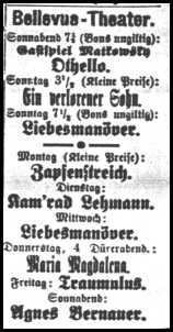 Im Bellevuetheater findet morgen Dienstag eine einmalge Aufführung des Dramas „Elektra” statt. Mittwoch geht „Kam'rad Lehmann” zum 3. Male in Szene. Am Donnerstag geht als Benefiz für den Oberregisseur Eugen Heiske zum erstenmale die Lustspiel-Novität „Liebesmanöver” in Szene. Das Werk ist von Frhrn. von Schlicht und Kurt Kraatz, dem bekannten Verfasser von „Hochtourist”, und gehört unstreitig zu den besten Lustspielen der Gegenwart. Der Benefiziant erfreut sich nicht nur als Regisseur der weitgehendsten Beliebtheit, sondern auch als Darsteller ist er ein hervorragender, gern gesehener Künstler. (Wir erinnern nur an die vortreffliche Wiedergabe des „Ale Schmalenbach” in „Haubenlerche”, des „Ulrichs” in „Strom”, des „Hauptmann von Winterstein” in „Soldaten”, des „Knabe” in „Seine Kleine” usw.) Es wäre dem verdienstvollen Künstler zu seinem Ehrenabende ein volles Haus zu wünschen.