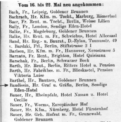 Graf und Gräfin von Baudissin verbrachten im weiteren Verlauf des Jahres 1909 die Zeit vom 22.5.1909 bis zum 4.7.1909 in Wiesbaden in „Sendigs Eden-Hotel”, Sonnenberger Straße 8.