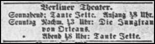 Im Berliner Theater fanden die Wiederholungen von „Tante Jette” am Sonnabend und Sonntag vor vollbesetztem Hause und einem beifallsfrohen Publikum statt. Die Verfasser H. von Wentzel und Frhrn. v. Schlicht haben von Wien aus den Antrag erhalten, das Stück für die dortigen Verhältnisse zu lokalisieren.