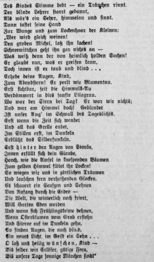 (1) Das Gedicht „Der blinde Feldgraue” erschien im „Berliner Tageblatt” vom 10.4.1915, Abend-Ausgabe, Seite 2 (Zurück)