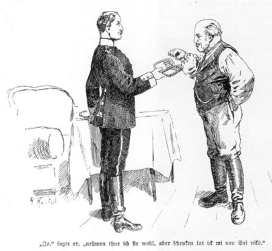 „Ja,” sagte er, „nehmen thue ich sie wohl, aber schenken lat ick mi von Sei nicks.”