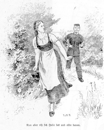 „Na, Fräulein, nehmen Sie sich das nur nicht zu sehr zu Herzen. Sie wissen ja, Undank ist der Welt Lohn. Kommen Sie, seien Sie nicht so traurig.” Er hatte sich ihr genähert, zog die sich mit Händen und Füßen Wehrende an sich und gab ihr — „bautz” — verschiedentlich was auf den Mund. Nun aber riß Julie sich los und eilte davon: „Sie Scheusal, Sie!”