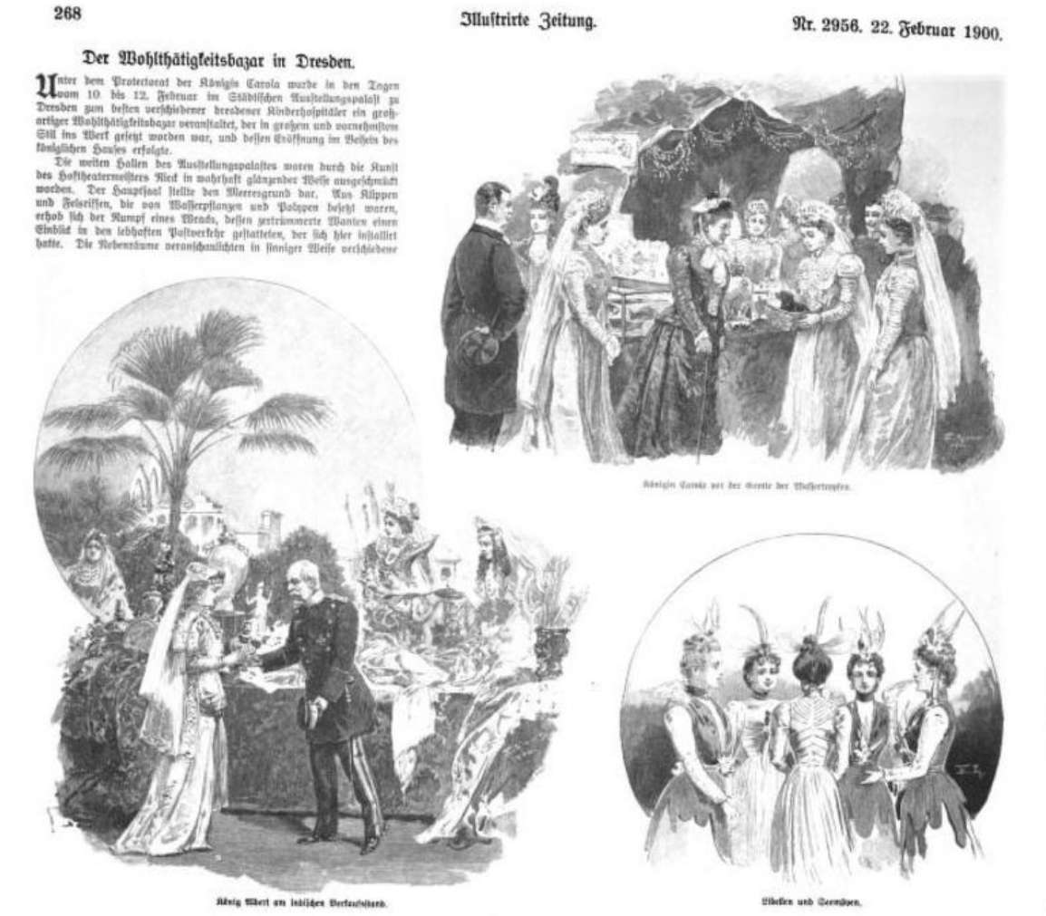 Der Wohltätigkeitsbazar in Dresden 10. bis 12.Febr. 1900Unter dem Protectorat der Königin Carola wurde in den Tagen vom 10. bis 12. Februar im Städtischen Ausstellungspalast zu Dresden zum besten verschiedener dresdener Kinderhospitäler ein großartiger Wohlthätigkeitsbazar veranstaltet, der in großem und vornehmstem Stil ins Werk gesetzt worden war, und dessen Eröffnung im Beisein des königlichen Hauses erfolgte. Die weiten Hallen des Ausstellungspalastes waren durch die Kunst des Hoftheatermeisters Rieck in wahrhaft glänzender Weise ausgeschmückt worden. Der Hauptsaal stellte den Meeresgrund dar. Aus Klippen und Felsriffen, die von Wasserpflanzen und Polypen besetzt waren, erhob sich der Rumpf eines Wracks, dessen zertrümmerte Wanten einen Einblick in den lebhaften Postverkehr gestatteten, der sich hier installirt hatte. Die Nebenräume veranschaulichten in sinniger Weise verschiedene Küstenländer. Dieser Staffage hatten die zahlreichen Damen, die sich als Verkäuferinnen in den Dienst der Wohlthätigkeit gestellt, ihre glänzenden Costüme angepaßt. Besonders schön waren die ferbenprächtigen Gewänder der Verkäuferinnen an den drei Tischen der Königin: im ersten Zelt herrschten schimmernde Perlen (s. die Abbildung), im zweiten und dritten schöne Schwedinnen und Norwegerinnen. Die Damen der Offiziere des Schützenregiments waren in kostbarer finnischer Tracht erschienen. An die Märchen von „Tausen und Einer Nacht” erinnerte der Saal „Indien”. Dunkeläugige Spanierinnen und Araberinnen, Bewohnerinnen der Bretagne, Madeiras und ....., Griechenlands und der Türkei, Japans und Hollands erregten Sehnsucht nach ihren Heimatländern, und Italiens schöne Kinder unter dem persönlichen Protectorat der Prinzessin Johann Georg, besiegten den Widerstand der verschlossensten Herzen. Glitzernde Seesterne, schillernde Wassertropfen, hellleuchtender Bernstein, zarte Seerosen, duftige Anemonen und Iris erzählten ebenso von der Wundern des Meeres wie Najaden, Wellen und Korallen. Leichtbeschwingte Seemöven bewegten sich friedlich in einem Element mit silberschuppigen Fischlein. Schlanke Libellen gaukelten umher und wetteiferten in Grazie mit den lieblichen Töchtern des kalten Dänemarks. Und wer sich an der Schönheit, die ihn umgab, nicht satt, sondern hungerig gesehen hatte, fand an den reichen Buffets vollauf Gelegenheit, den Appetit zu befriedigen. Eine zahllose Menschenmenge füllte beständig die weiten Räume. Die zum Theil sehr werthvollen Verkaufsgegenstände fanden reißenden Absatz und führten dem edeln Zweck des Unternehmens weit über hunderttausend Mark zu. Am 15. Februar fand die dankenswerthe Veranstaltung durch einen Subskriptionsball ihren Abschluß. König und Königin beehrten den Ball mit ihrer Gegenwart, wie denn überhaupt die Mitglieder des Hofes ihr lebhaftes Interesse für das der Wohlthätigkeit gewidmete großartige Werk durch wiederholten Besuch und zahlreiche Einkäufe bethätigten. Graf v. Baudissin (Frhr. v. Schlicht)