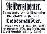 Residenztheater. Aus dem Bureau des Residenztheaters wird uns geschrieben: Morgen gelangt der Schlager der Saison, das unterhaltende Lustspiel „Im bunten Rock” zur Aufführung. Die Spielzeit dauert nur noch bis zum 18.September.