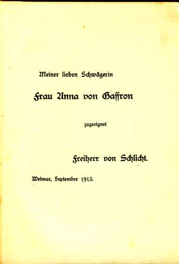 Offener Brief des Frhrn.v.Schlicht an den Herausgeber der „Deutschen Roman-Zeitung”, Herrn Dr. Erich Janke. in: „Deutsche Roman-Zeitung”, 43.Jahrgg. 1906, Erster Band, Seite 101-104 |