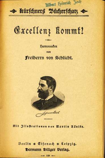 Albert Langens Verlagskatalog mit einer Selbstbiographie von Frhr.v.Schlicht und einer Karikatur von Olav Gulbransson auch in: „Iserlohner Kreisanzeiger” vom 8.10.1926 |