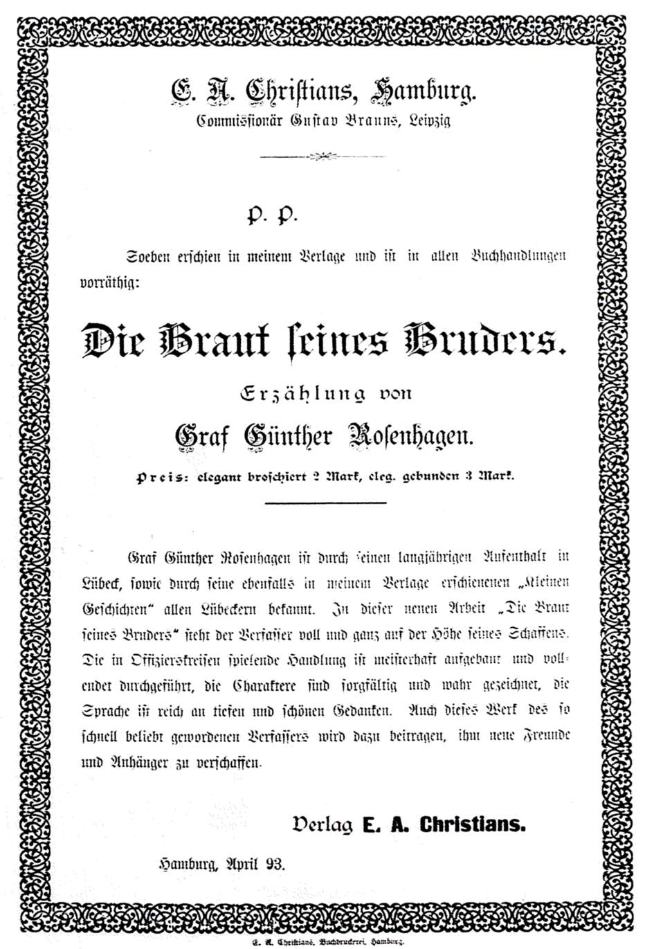 Die Braut seines Bruders Erzählung von Graf Günther Rosenhagen Christians, Hamburg, 1893, 150 S. Verlagsanzeige dazu Besprechung dazu |